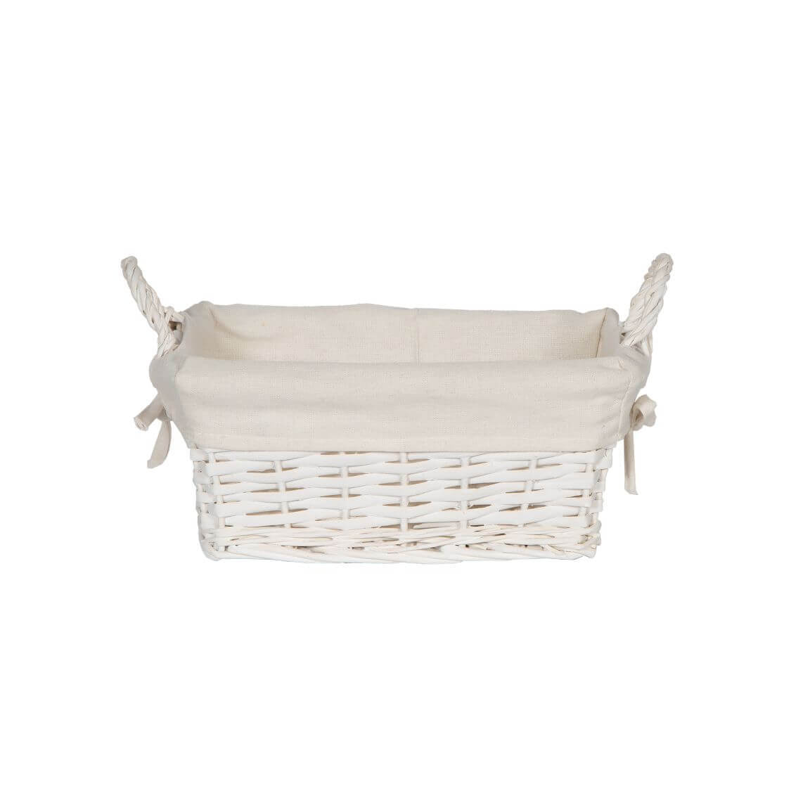 RECTANGULAR WHITE PAINTED BASKET EAR HANDLES AND FABRIC